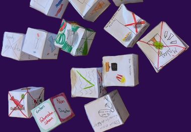 Es ging aber nicht nur um Verzicht, sondern bewusst etwas zu tun, was man sonst nicht so gerne mag, wie z.B. den Tisch abräumen oder den Geschirrspüler auszuräumen und so zum Familienalltag beizutragen. Jedes Kind wählte eigene Themen aus und gestaltete so die sechs Seiten des Würfels mit verschiedenen Motiven.
