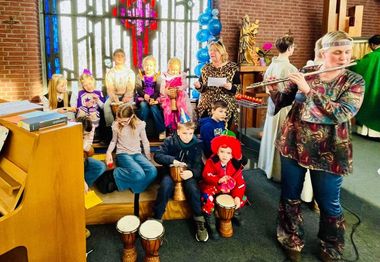 Die Kinder wurden aktiv beteiligt. Der Bereich neben der Orgel wurde von Kirchenbänken freigeräumt und mit Podesten erhöht, so dass die kostümierten Kinder dort Platz nehmen konnten. Es wurden drei Lieder vor der Messe eingeübt und mit der Gemeinde gesungen, wobei die Kinder mit Hilfe verschiedener Klanginstrumente die Klavier- und Querflöten-Musik trommelnd und rasselnd unterstützt haben. Auch das Kyrie und die Fürbitten wurden von Kindern vorgelesen.