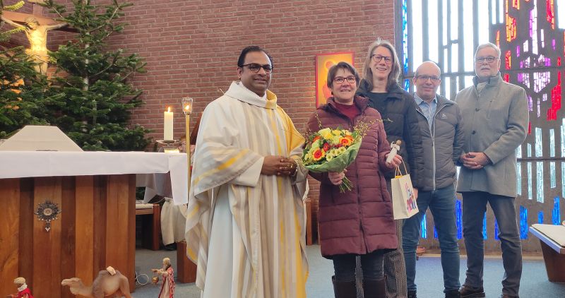 Frau Kühn dankte für die Ehrung und sprach der Gemeinde ihren Dank aus für die herzliche Aufnahme vor 35 Jahren, als sie und ihre Familie berufsbedingt nach Stuhr gezogen waren. Bereits vor ihrer Tätigkeit als Pfarrsekretärin engagierte sich Frau Kühn ehrenamtlich in der Pfarrei und gründete und betreute z.B. den „Kreis junger Familien“. Die Arbeit als Pfarrsekretärin und die Arbeit mit den Menschen bereite ihr nach wie vor sehr viel Freude und St. Paulus sei ihr und ihrer Familie „zur zweiten Heimat geworden“.