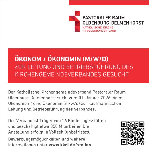 Der Katholische Kirchengemeindeverband (KKGV) im Pastoralen Raum Oldenburg-Delmenhorst sucht zum 1. Januar 2025 eine/n Ökonomen/Ökonomin (m/w/d) zur kaufmännischen Leitung und Betriebsführung des KKGV als Träger von 16 Kindertagesstätten mit etwa 350 Mitarbeitenden.
